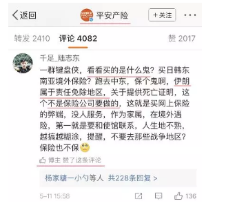 不僅如此,在這條微博下面,平安產(chǎn)險的官方微博點(diǎn)贊了一條評論: