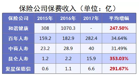 這兩家保險公司的年保費收入迅速增長(cháng),在2017年的時(shí)候,更是成倍增長(cháng)。