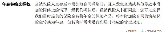 2)合同到期的情況下,將合同的保險金轉換成年金產(chǎn)品,也就是把一次性領(lǐng)取的滿(mǎn)期金換成每年領(lǐng)取的年金。