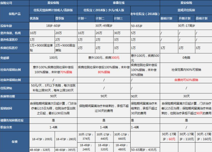 目前,線(xiàn)上有幾種小型醫療保險相對高質(zhì)量。他們分別是:易安住院無(wú)憂(yōu)保障計劃、 泰康在線(xiàn)住院寶、 易安藍精靈住院保。對比圖如下: