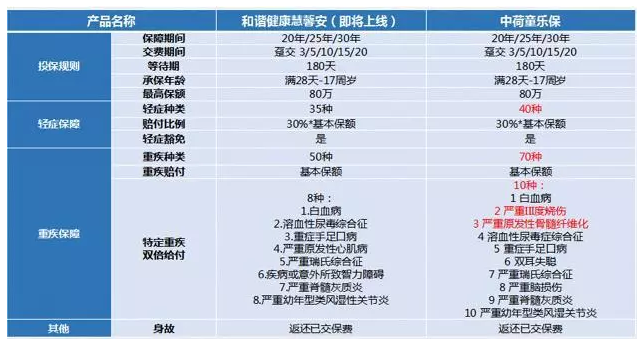 1.我們可以看出這兩個(gè)產(chǎn)品都在保障責任結構和基本信息如支付期,等待期,保障期等都是一樣的,中荷童樂(lè )保重疾種類(lèi) 70例,輕癥40種,特定疾病10種都多過(guò)慧馨安。