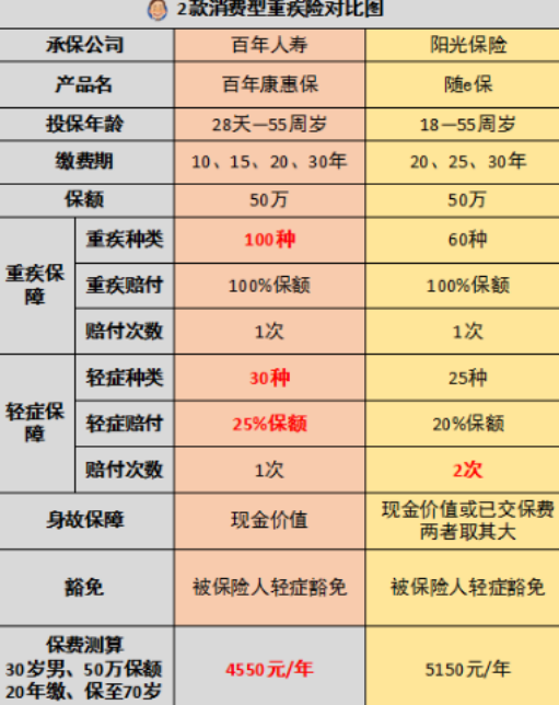 百年康惠保和健康一生A進(jìn)行比較。圖中的紅色字符各自具有優(yōu)勢。