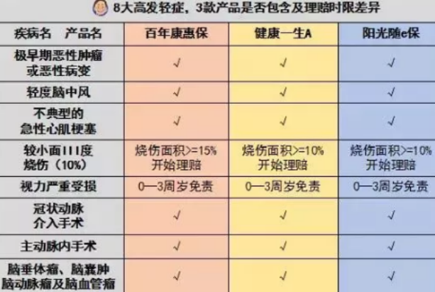由于對輕癥沒(méi)有統一的規定,我根據保險公司的理賠數據找到了8款高位輕癥,判斷這三個(gè)產(chǎn)品是否覆蓋了理賠的時(shí)差,如下圖所示:
