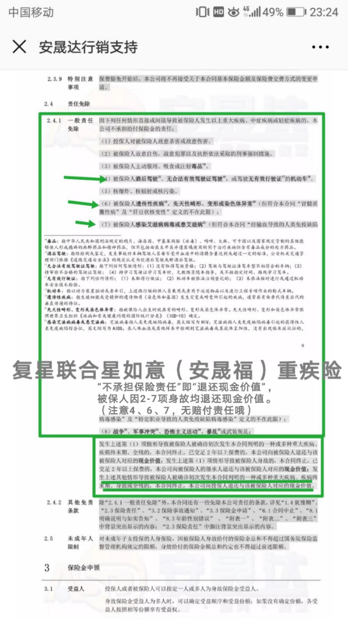 復星聯(lián)合星如意(安晟福),“被保人二年內自殺”、“核爆炸”可以得到身故賠付(按保額),但“酒駕”、“感染艾滋病病毒”、“遺傳性疾病”等不得到身故賠償責任(僅退還現金價(jià)值)。