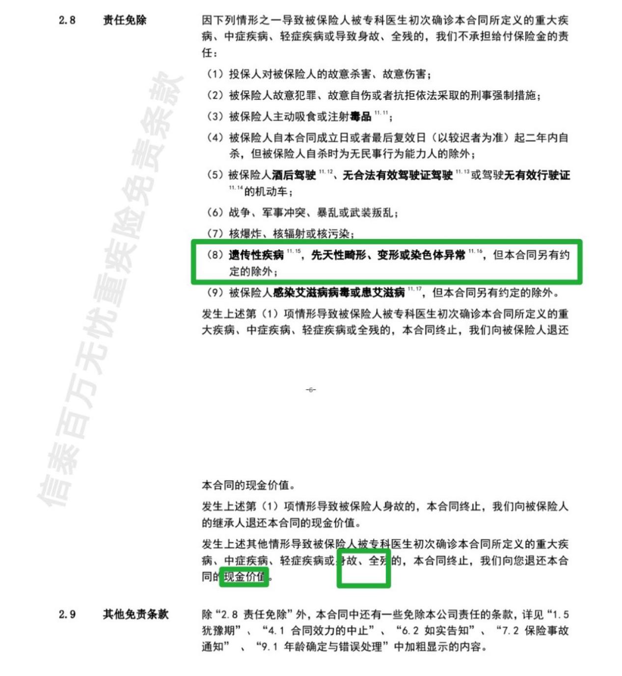 “二年內自殺”、“故意自傷”、“感染艾滋病病毒”、“遺傳性疾病”、“戰爭”、“核爆炸”等等這幾種情況,如果身故能夠賠付,當然是極好的。能夠賠付的條款越多越好!