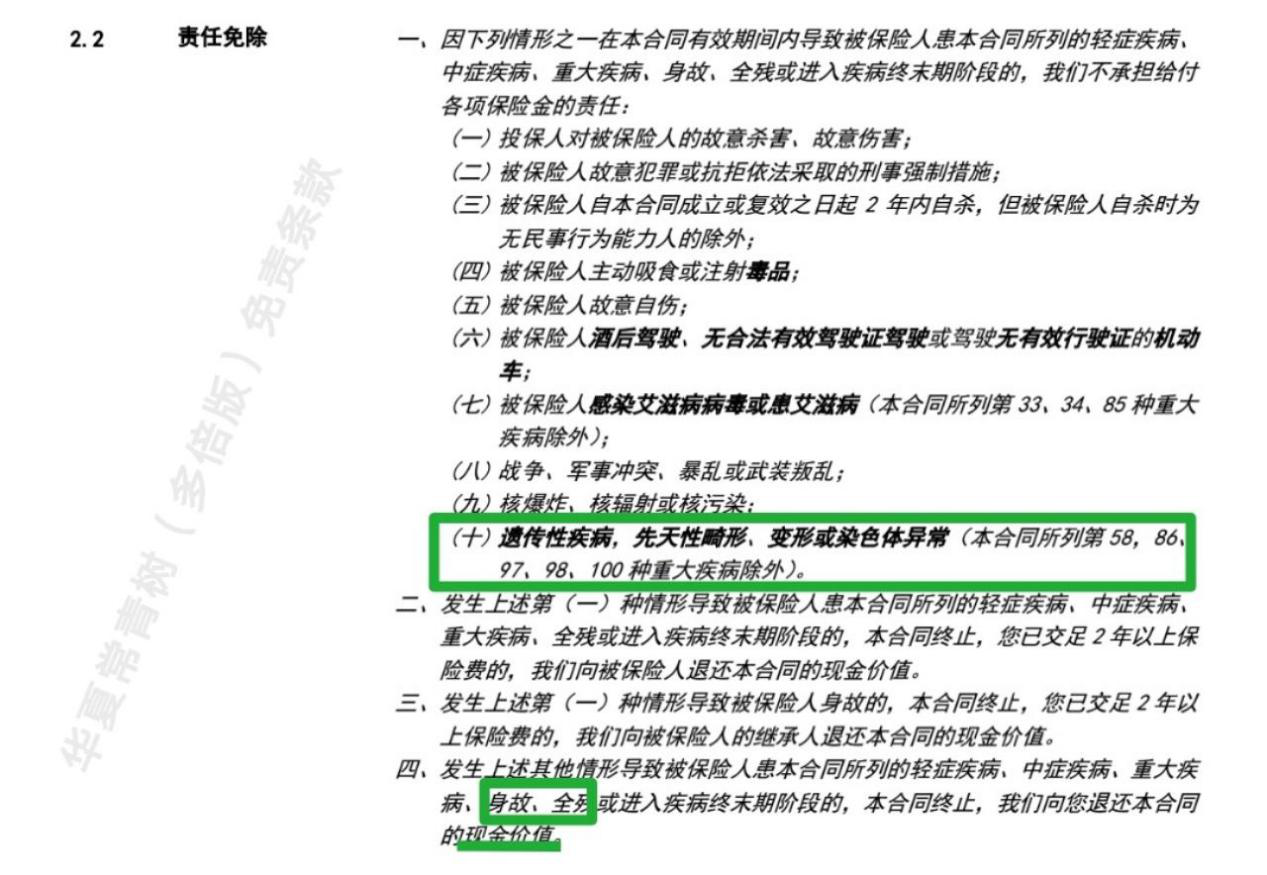 華夏常青樹(shù)多倍版,被保人“故意自傷”、“酒駕”、“感染艾滋病病毒”、“遺傳性疾病”等均不能得到身故賠付(僅退還現金價(jià)值)。