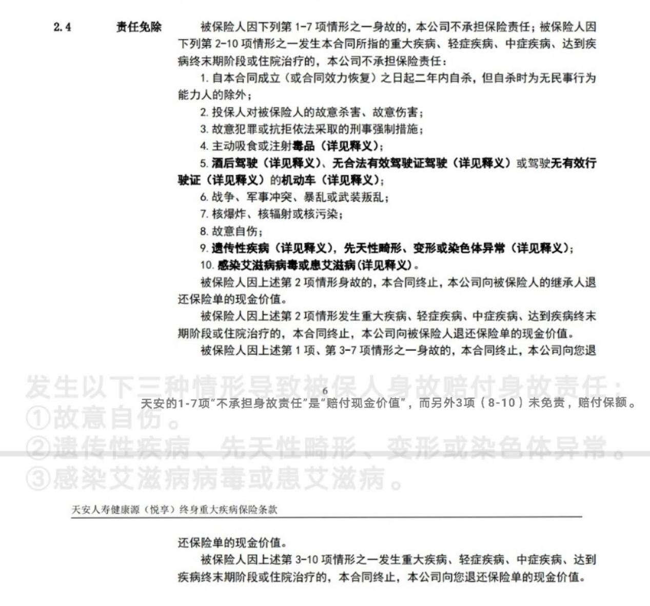 天安健康源悅享,“酒駕”、“吸毒”、“核爆炸”、“戰爭”、“二年內自殺”等等情況沒(méi)有身故賠付責任(僅退還現金價(jià)值),而“故意自傷”、“感染艾滋病病毒”、“遺傳性疾病”等等情況是可以得到身故賠付的(按保額)。