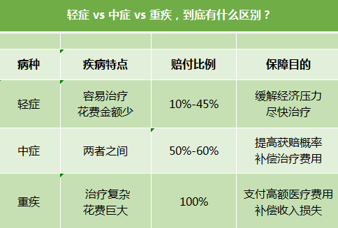 從表格中,我們可以看出,輕癥、中癥和重疾各自的疾病特點(diǎn),賠付比例以及保障的目的。今天小編主要跟大家講一下,重疾險中的中癥是什么意思?以及如何挑選?