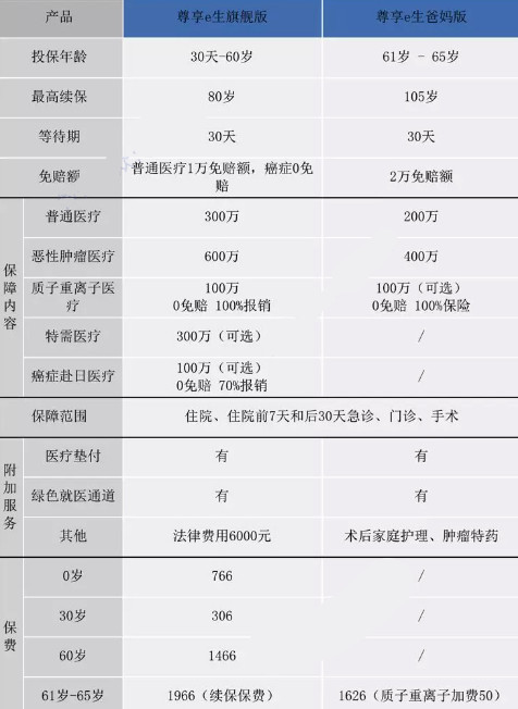 尊享e生爸媽版的保障內容類(lèi)似于尊享e生旗艦版e,并且由重大事故或疾病引起的住院費用的報銷(xiāo)不限制醫療保險的內外。